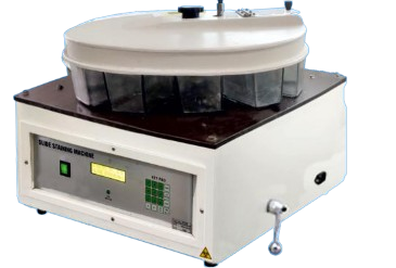 Microprocessor based Slide Staining Machine provides a modern user interface operated through a feather touch keypad, easy to do programming interface and a digital display with a continuous visual update.